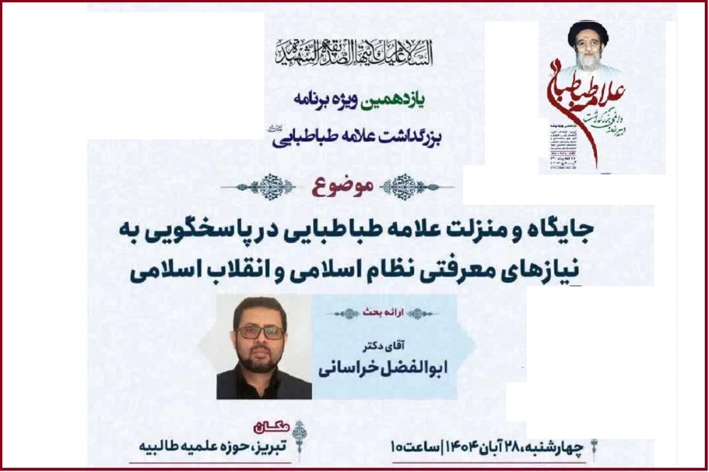 پایگاه اطلاعرسانی اسراء: نشست علمی با موضوع «جایگاه و منزلت علامه طباطبایی در پاسخگویی به نیازهای معرفتی نظام اسلامی و انقلاب اسلامی» با سخنرانی دکتر ابوالفضل خراسانی، معاون فرهنگ و دین بنیاد بینالمللی علوم وحیانی اسراء، روز ۲۸ آبان ۱۴۰۴ در حوزه علمیه طالبیه تبریز برگزار شد.