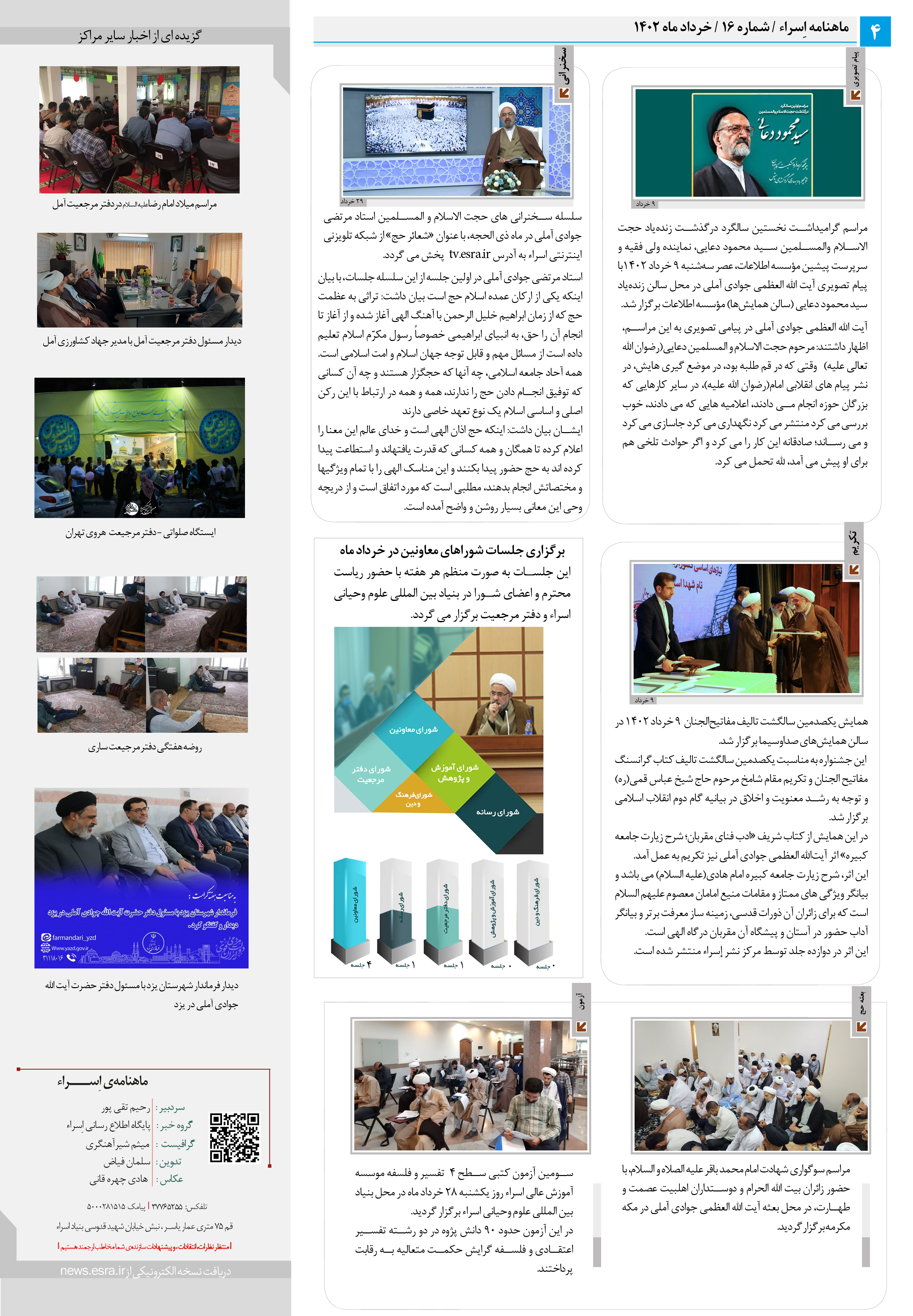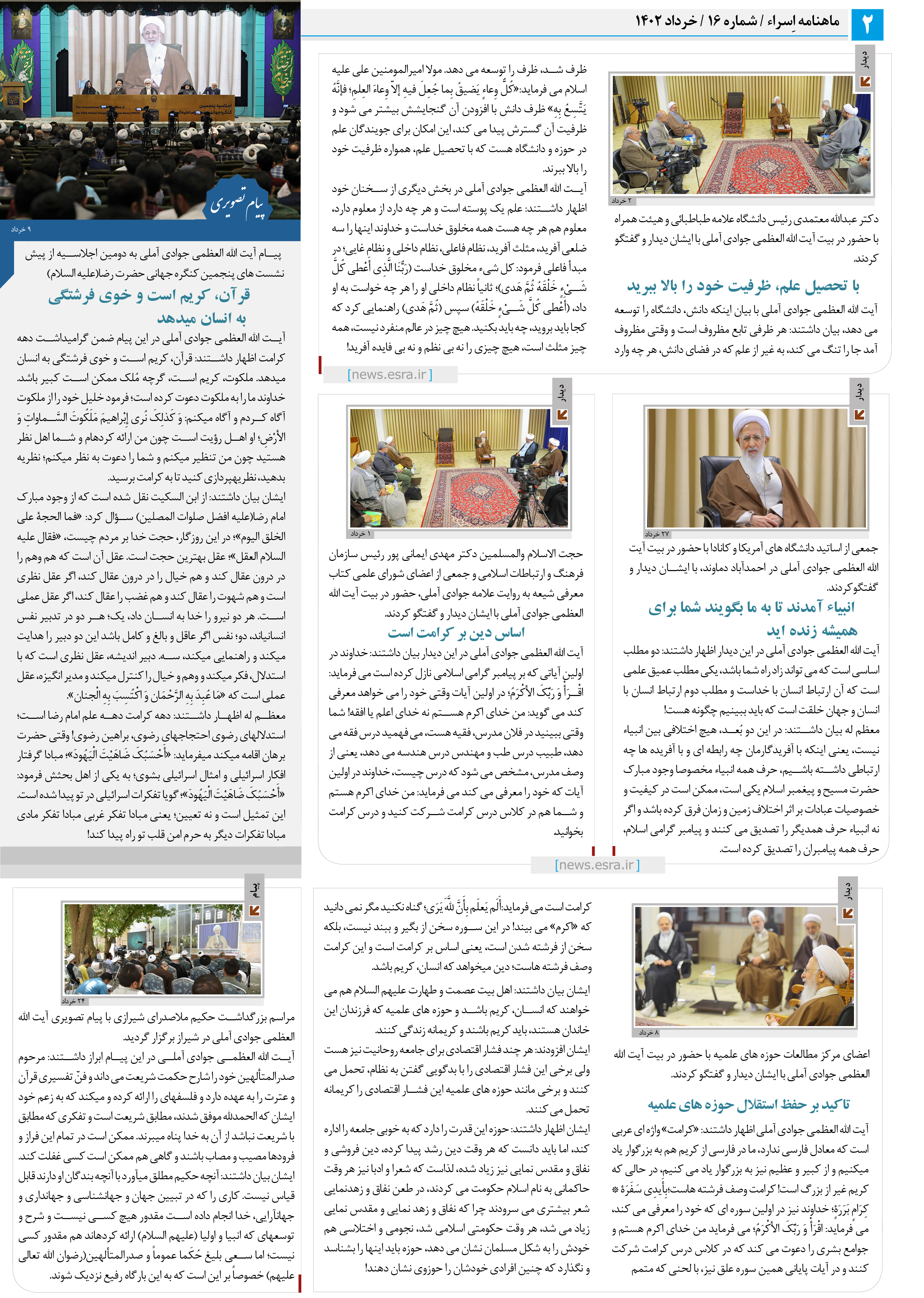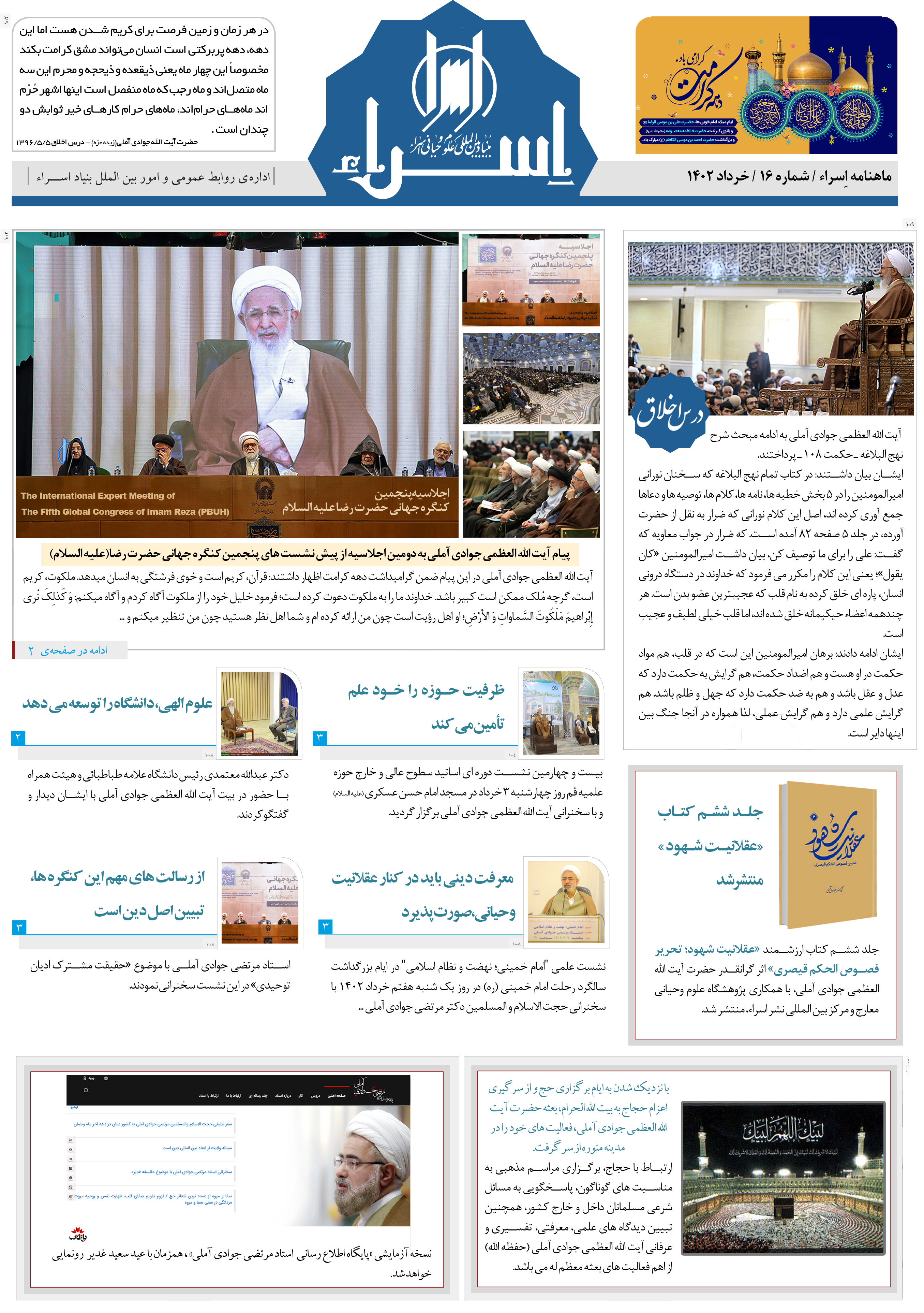پایگاه اطلاع رسانی اسراء: به همت اداره روابط عمومی و امور بین الملل بنیاد اسراء، ماهنامه اسراء که مروری است بر اخبار و فعالیت های ماهانه بنیاد اسراء (شماره 16، خردادماه 1402) آماده و منتشر شد.