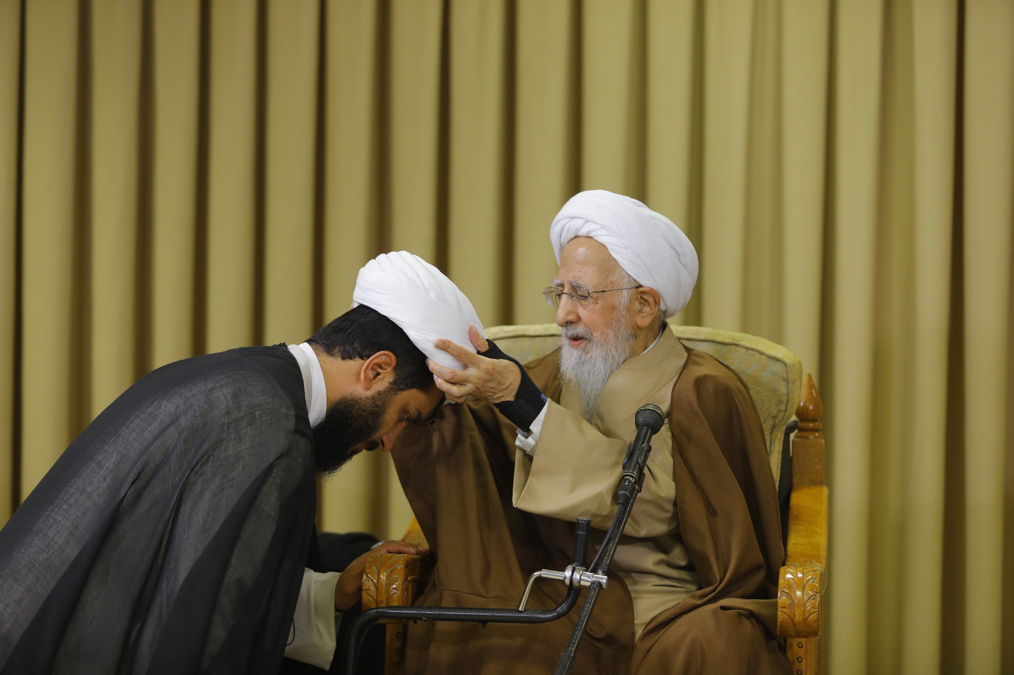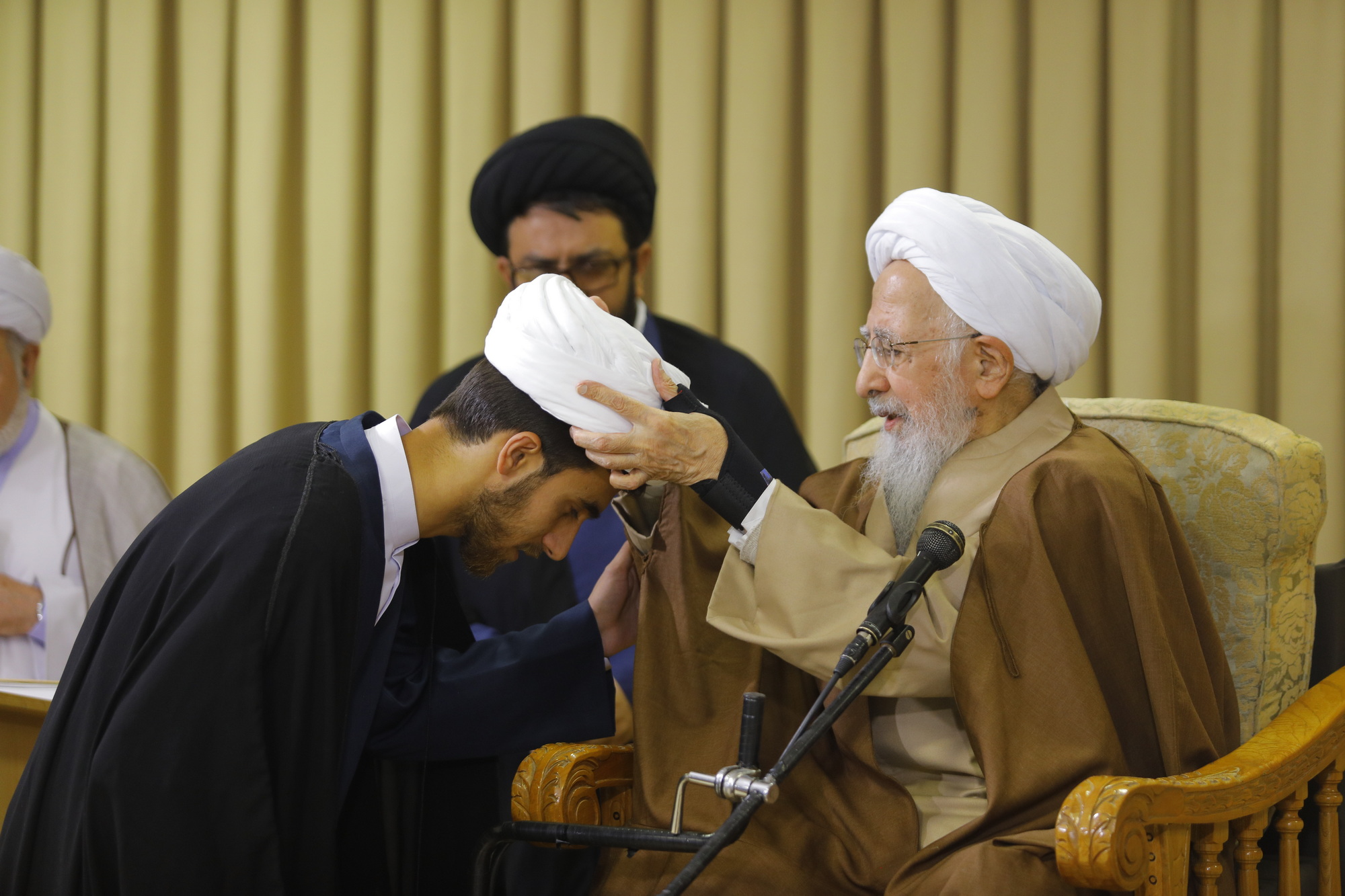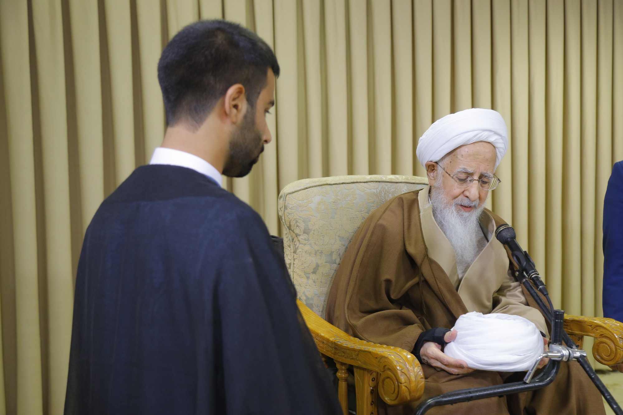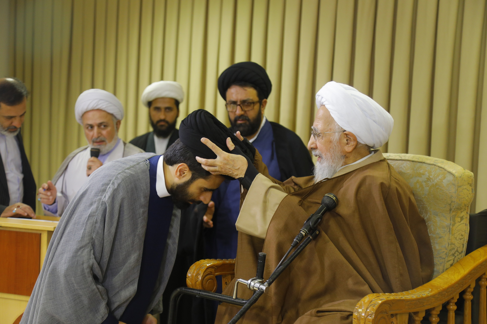 مراسم عمامه گذاری جمعی از طلاب توسط آیت الله العظمی جوادی آملی در سالروز 17 ربیع الاول؛