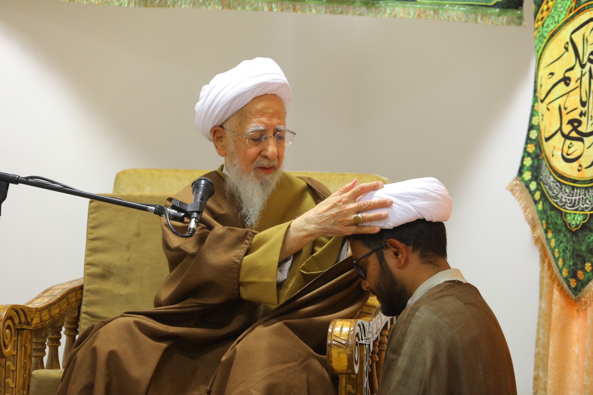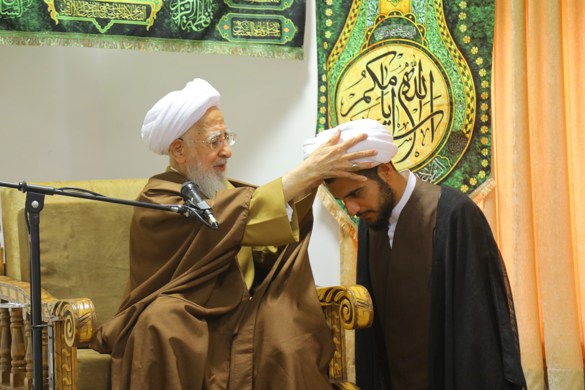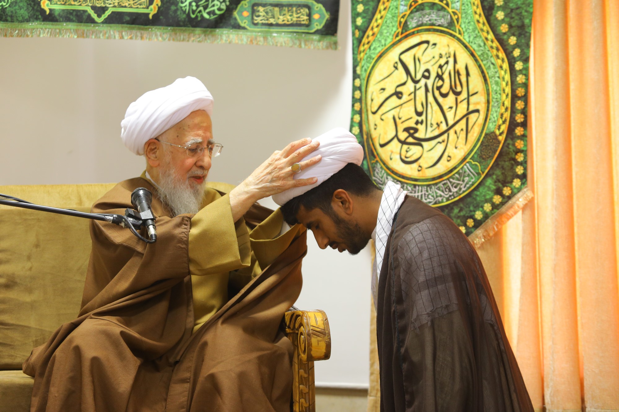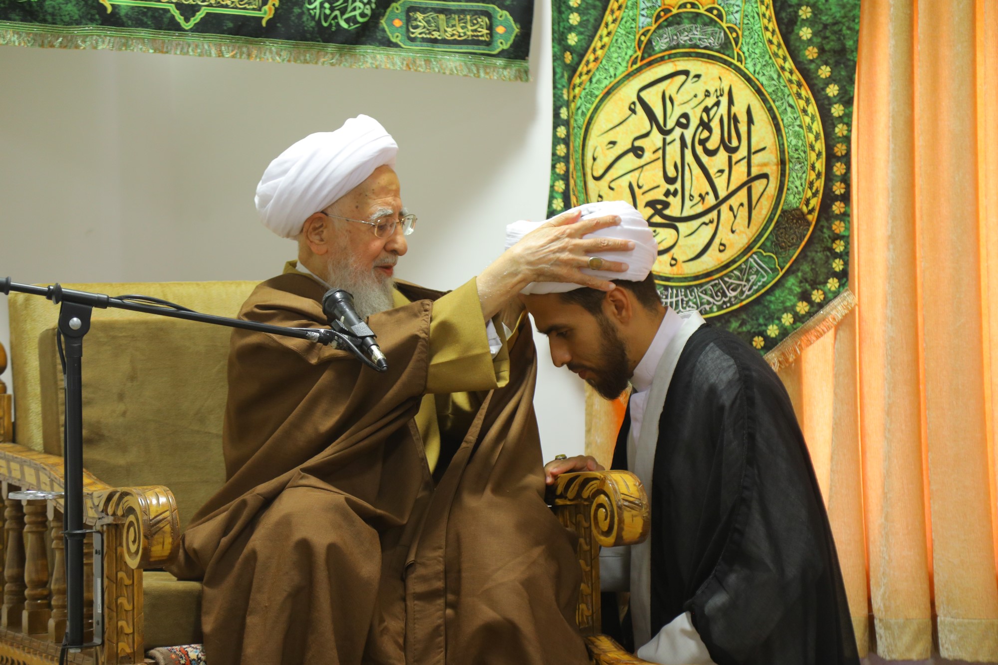 مراسم عمامه گذاری جمعی از طلاب توسط آیت الله العظمی جوادی آملی در سالروز 17 ربیع الاول - خبرگزاری اسراء