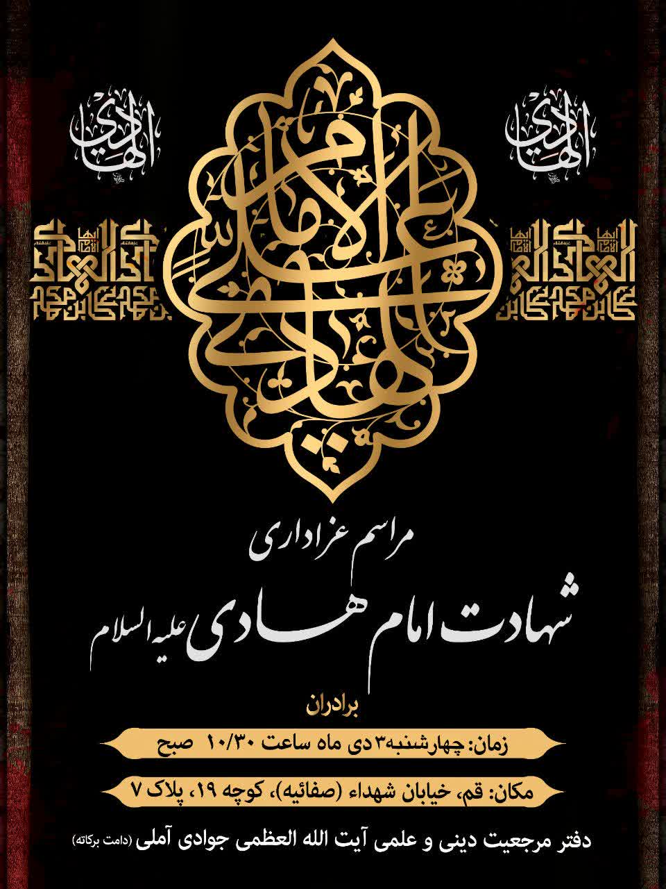 ​​​​​​​به اطلاع می رساند مراسم سوگواری به مناسبت فرا رسیدن سالروز شهادت حضرت امام هادی سلام الله علیه در دفتر آیت الله العظمی جوادی آملی در قم برگزار میگردد