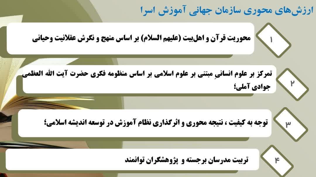 حجت الاسلام و المسلمین روح الهی معاون آموزش بنیاد بین المللی علوم وحیانی اسراء، گزارشی از فعالیت های آموزشی ارائه نمود و بیان داشت: با توجه به اهمیت مباحث کلامی و تاکید حضرت استاد در سال قبل، رشته کلام اسلامی به حوزه دانشی موسسه آموزش عالی اسرا اضافه و مجوزات لازم نیز اخذ شده است، و امسال در سه حوزه دانشی قرآن، فلسفه و کلام اسلامی فعالیت آموزشی خواهیم داشت.