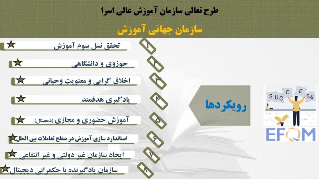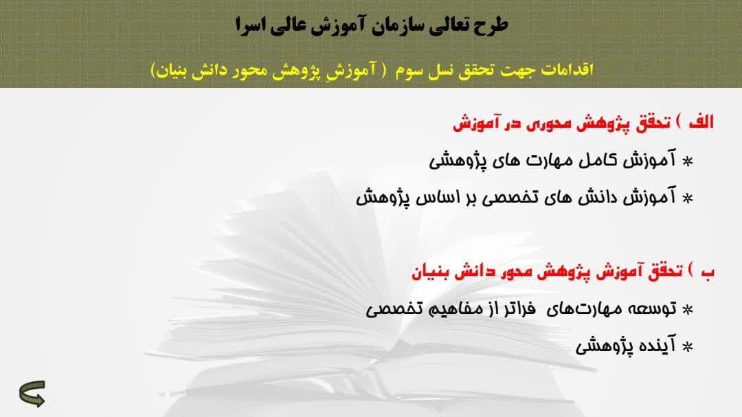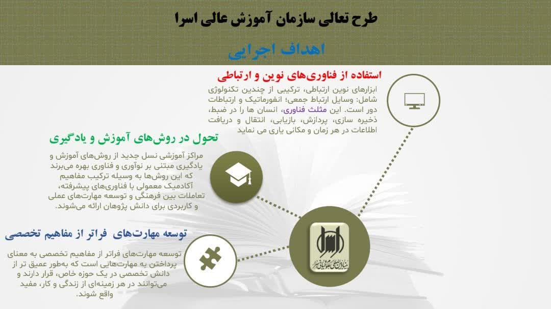 وی برنامه اصلی بخش آموزش را تعالی سازمانی بیان کرد و اظهار داشت: نسل اول آموزش به مراکز آموزشی گفته می شود که آموزش و تحقیق است و با پایان نامه به پایان می رسد، نسل دوم، موسسات آموزشی هستند که ضمن آموزش، پژوهش پیشرفته را دارا هستند و با دکترای پژوهشی به پایان می رسند و نسل سوم دانشگاه هایی هستند که دانش را به فنآوری تبدیل کردند که دوره آموزشی با تولید علم یا محصولات علمی، به پایان می رسد و این نسل بیشترین ارتباط را بین دانشگاه و جامعه برخوردار است، لذا در سال جدید برنامه اصلی ما در آموزش اسراء، تعالی سازمانی است که در مباحث علمی، شاهد ارتقاء به نسل سوم آموزش یعنی همان«آموزشِ پژوهش محورِ فنآورانه» بوده و در بخش مدیریتی، شاهد تغییر اساسی در (متد آموزشی ) برای رسیدن به حکمرانی دیجیتال خواهیم بود.